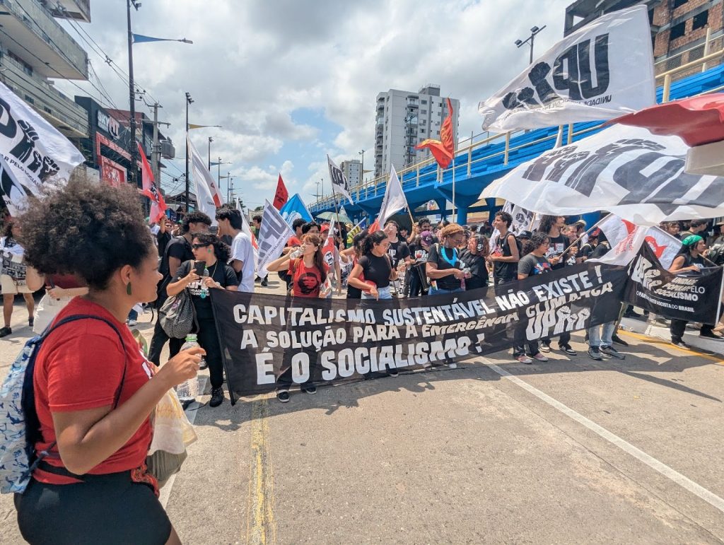 Young people wearing black and red clothing march through Belém do Pará carrying signs, a large one of which says, “Sustainable capitalism doesn’t exist! The solution to the climate emergency is socialism!” Other flags among the group mention the organization “Popular Unity towards Socialism.” Photo by the author.