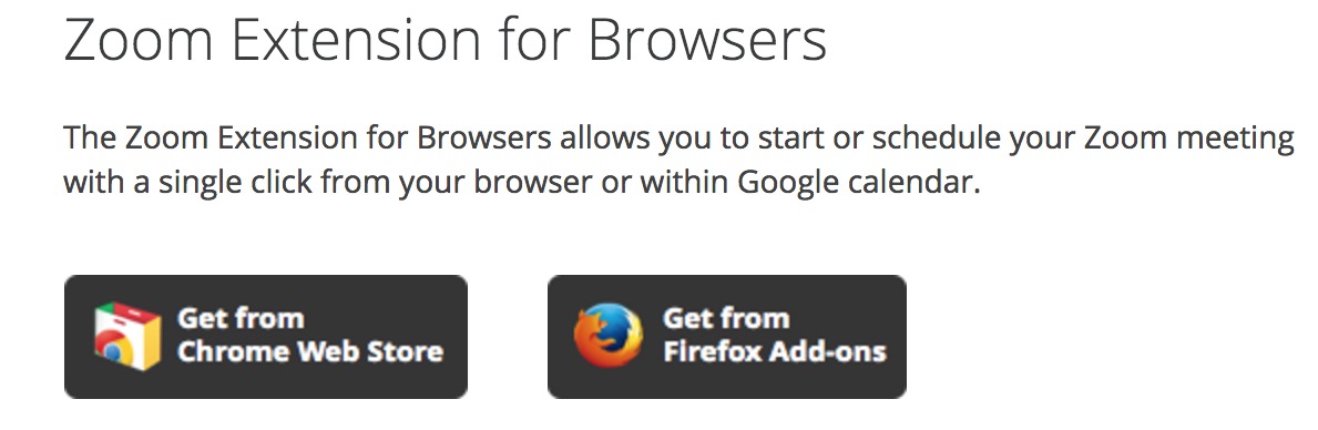 The Zoom Extension for Browsers allows you to start or schedule your Zoom meeting with a single click from your browser or within your Google calendar. Once you add one of the extensions to your browser, a Zoom Meeting button will automatically appear in your calendar.