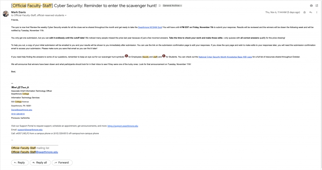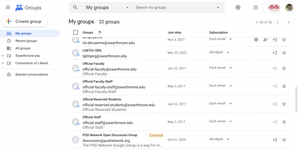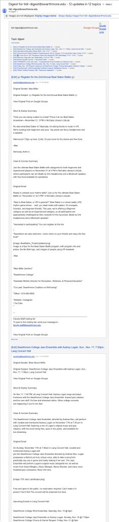 Good news! Swarthmore’s Accessibility Working Group identified communication as one of our improvement goals for the year. In light of that, Liz Derickson and I met up to review subscription options in Google Groups—and we think we found the keys to email sanity.