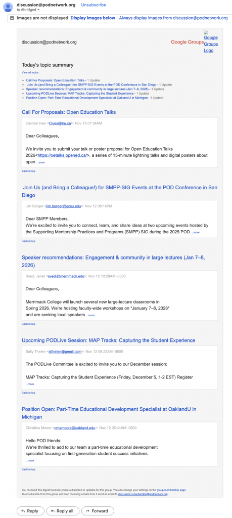 - You select the more… option in the email to view the entire content via the Google Groups web interface.