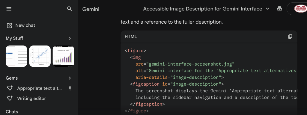 In short, the Gem creates accessible image descriptions using the World Wide Web Consortium (W3C) Web Accessibility Initiative’s (WAI) Image Description Tutorial and the Web Content Accessibility Guideline’s (WCAG) relevant image guidance. We coupled these with specific instructions for Gemini, including having the alternative text be concise but descriptive.
