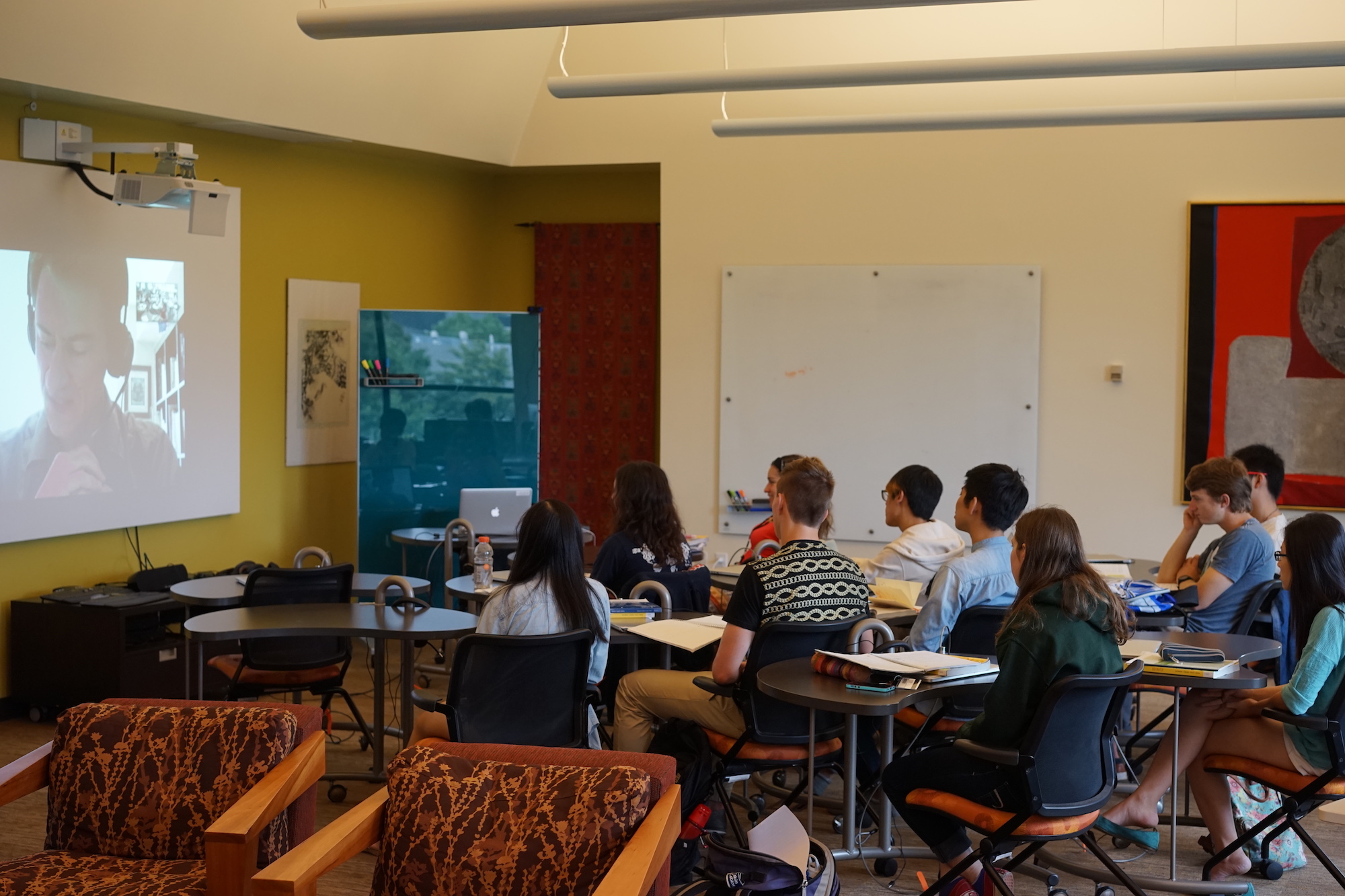 Benjamin – Zoom conference session Remote teaching using Zoom video conferencing software, a webcam and table microphone.